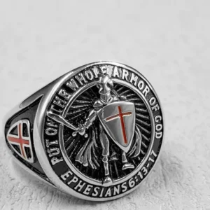 La bague sceau des templiers incarne la bravoure et l’héritage des Templiers avec un style saisissant. Conçue en acier inoxydable, cette chevalière ronde est disponible en argent ou en or, offrant une touche de prestige et d’élégance. Son motif finement gravé représente un soldat portant épée et bouclier, symbole de défense et de loyauté. Le bouclier est orné d’une croix, rappelant les valeurs et le courage des chevaliers. Ce bijou est idéal pour les hommes qui souhaitent exprimer leur attachement aux traditions et à l’esprit des Templiers.