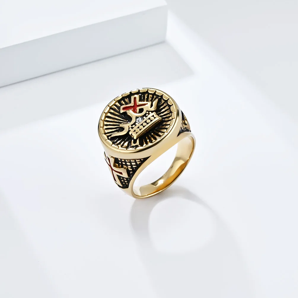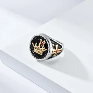 Cette bague templiers en acier inoxydable associe croix sacrée et couronne royale dans un design majestueux. Sa finition or ou argent et sa gravure détaillée en font une chevalière d’exception, héritière des traditions templières.