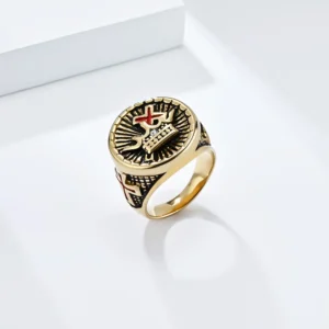 Cette chevalière majestueuse incarne la puissance et le mystère de l’ordre des Templiers. Elle marie symbolisme sacré et élégance intemporelle dans un bijou d’exception. Son design noble évoque la grandeur des chevaliers qui ont marqué l’histoire.